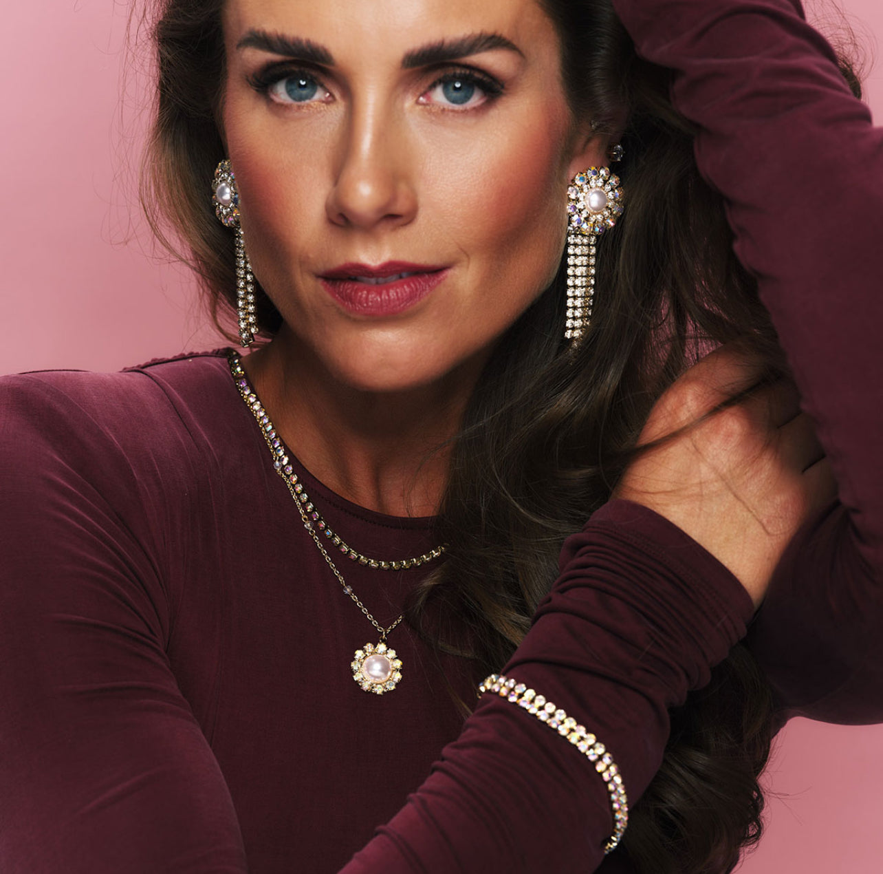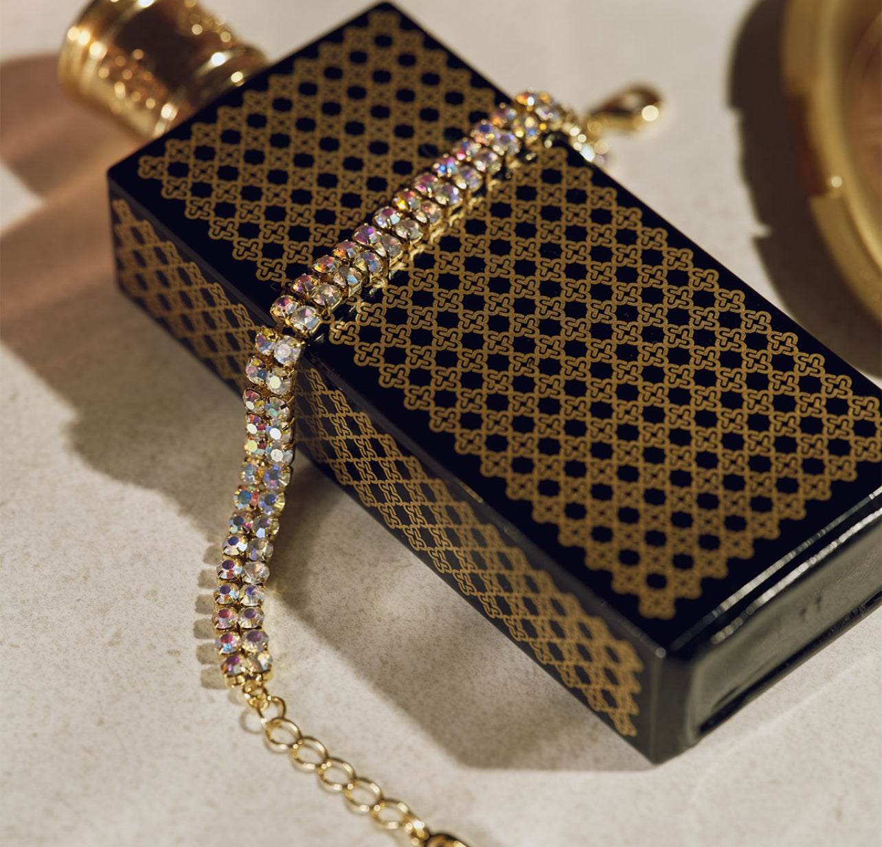 Et tidløst, rått og samtidig glamorøst armbånd dekorert med to rader krystallsteiner i Aurora Borealis effekt. Designet for å passe til alt! Tone Damli by A&C Oslo, en smykkekolleksjon som oser av femininitet, lekenhet og eleganse. Høy kvalitet, laget i begrenset antall.