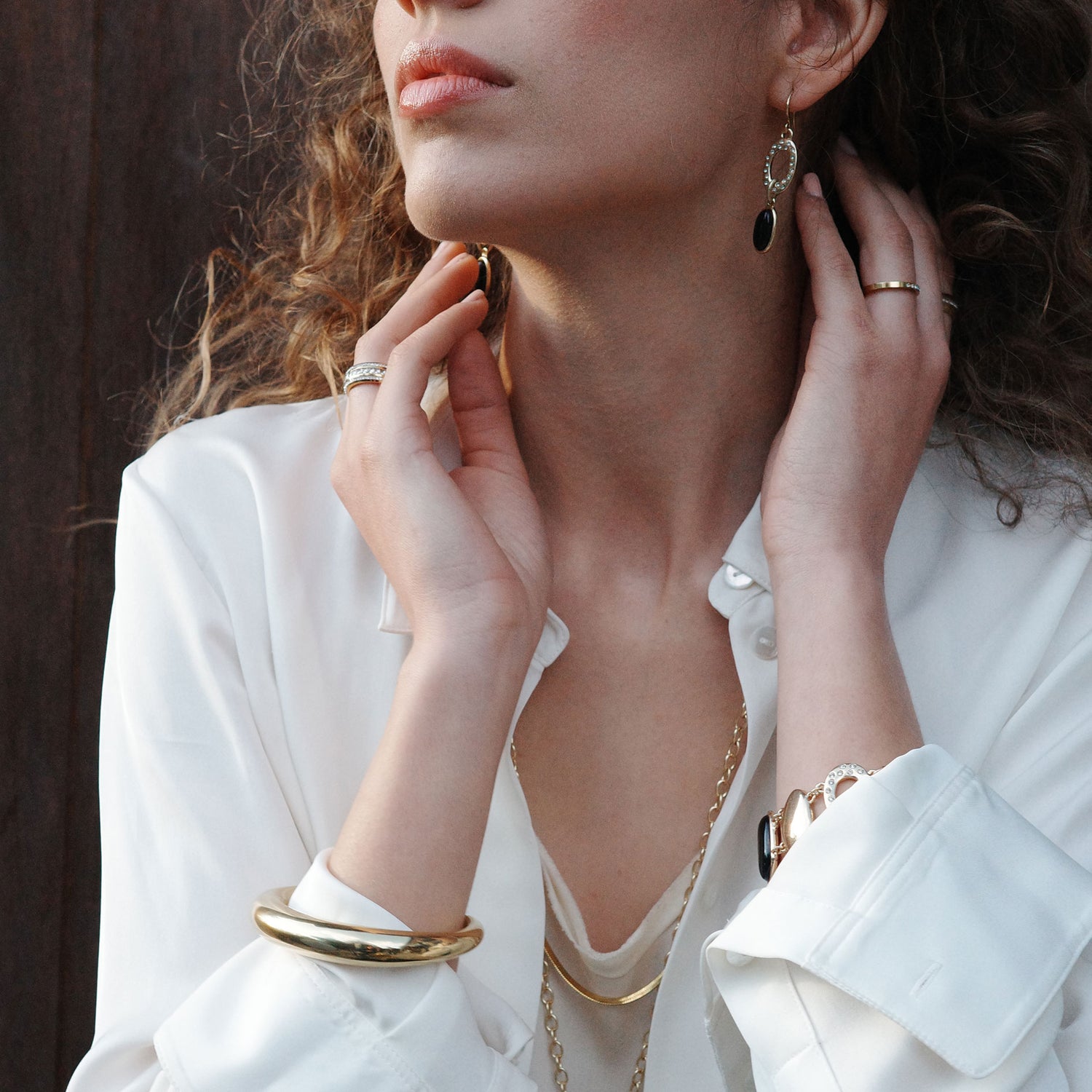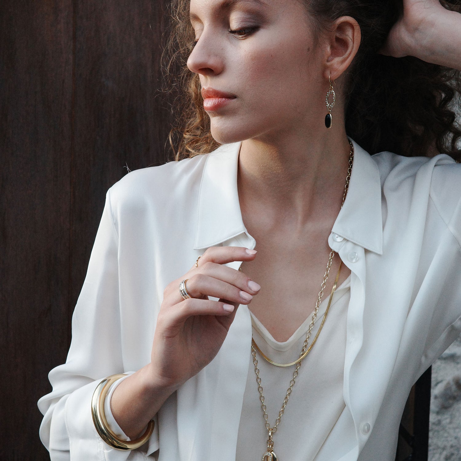 Liquid er en stilren og tidløs kolleksjon med myke metalliske former og dråpelignende elementer i håndslipt glass. To av øredobbene er helt enkle og uten stener – diskrete "must-haves" som passer til alt. Enten du går for det enkle eller det mer uttrykksfulle, er dette smykker som flyter like godt med hverdagslooken som med festantrekket. Alle smykkene er belagt med ekte gull.