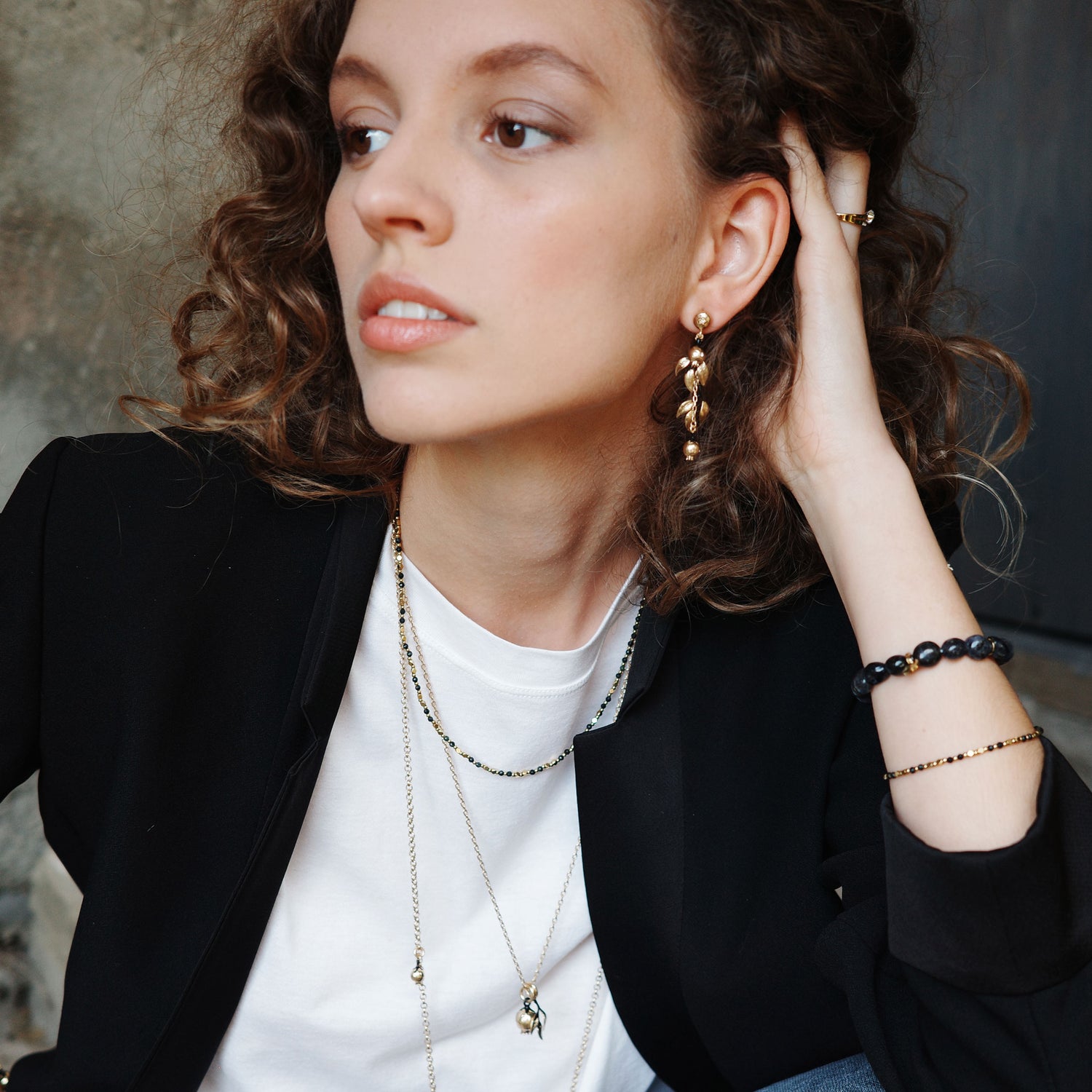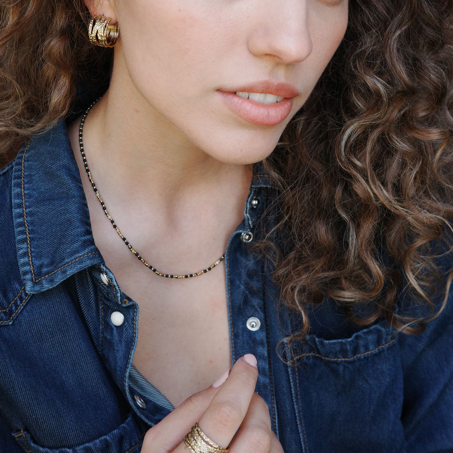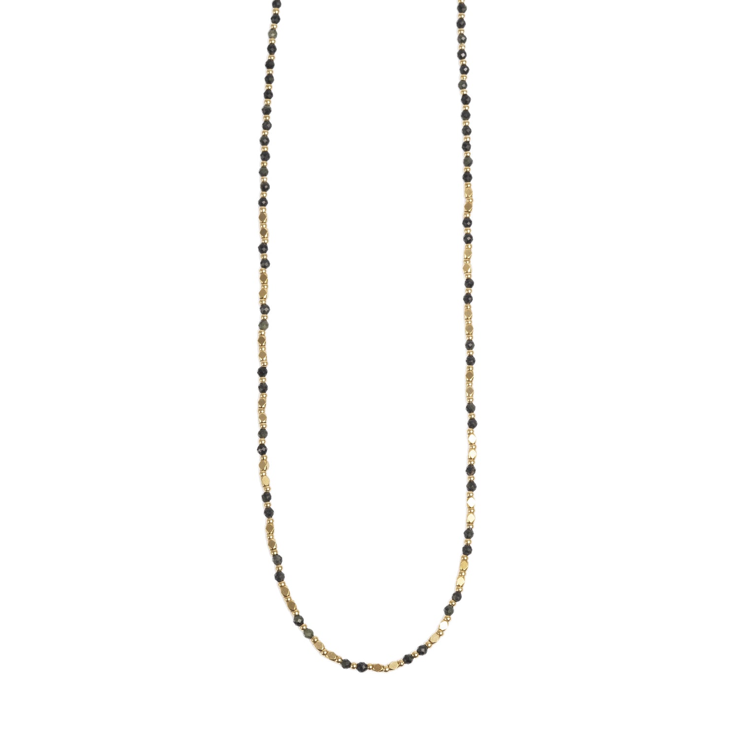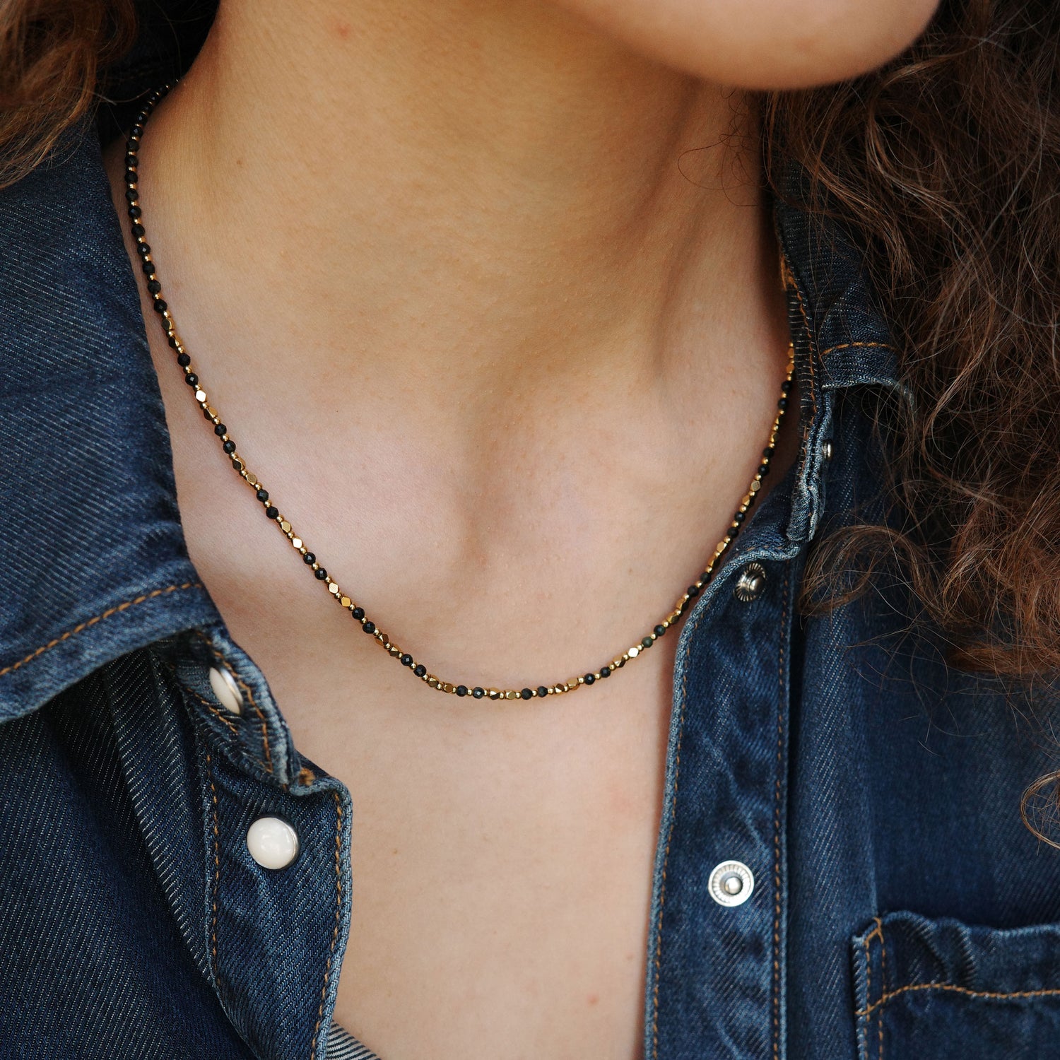 Kort kjede med små delikate sorte halvedelstener. Et lekkert kjede som lett kan brukes til mange ulike stiler og anledninger.