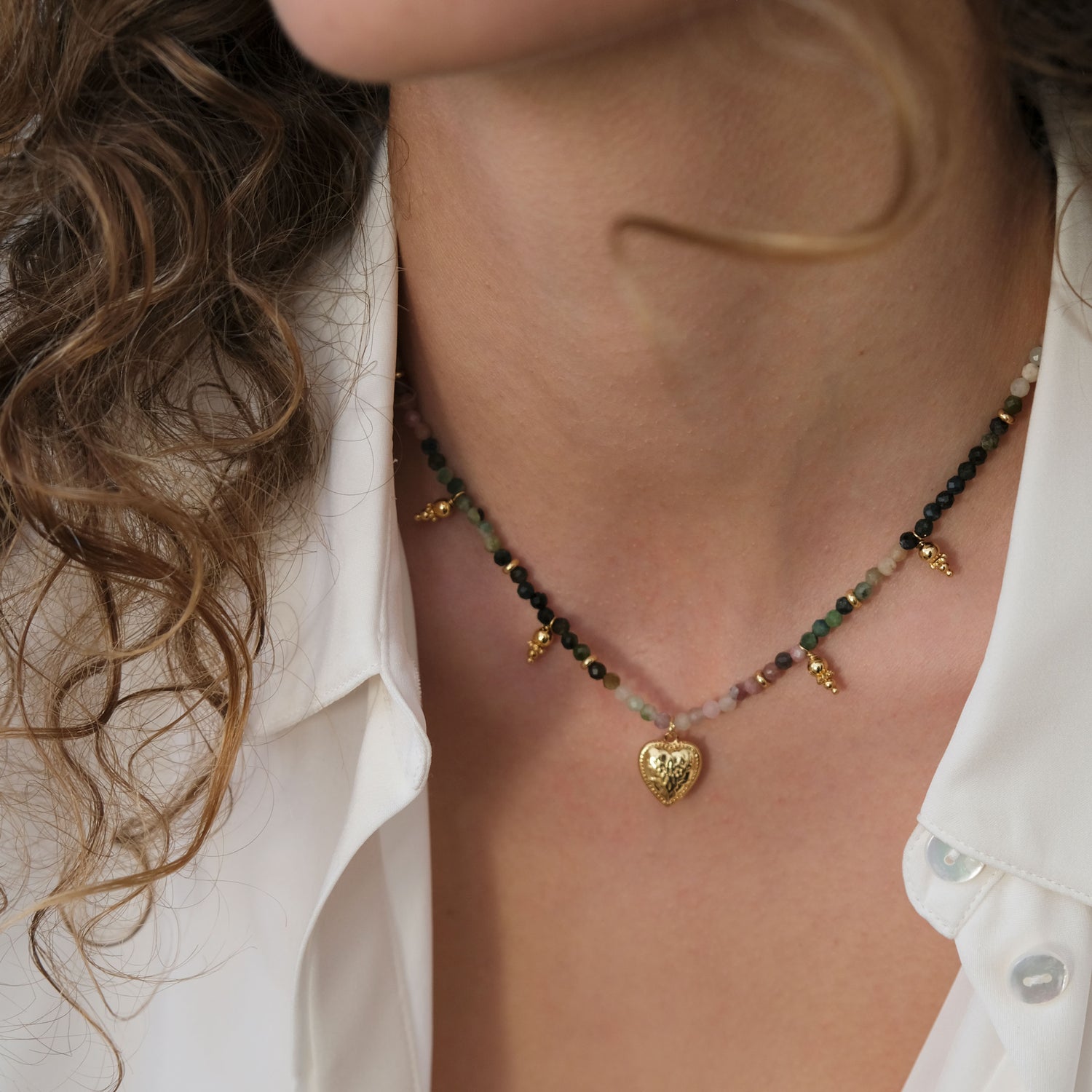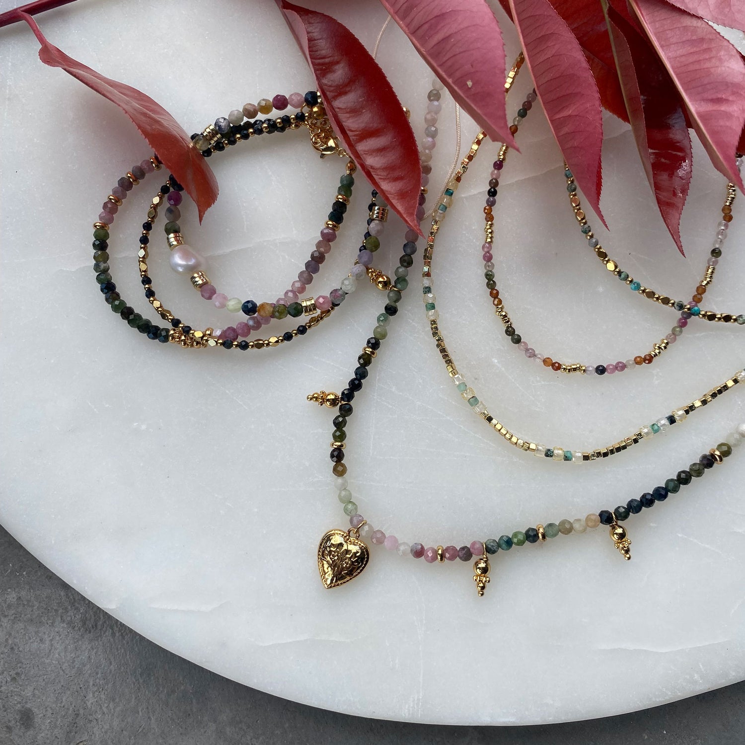 Delikat kjede med unikt fargespill. Kjedet er satt sammen av ekte halvedelstener og detaljer i gullbelagt stål.