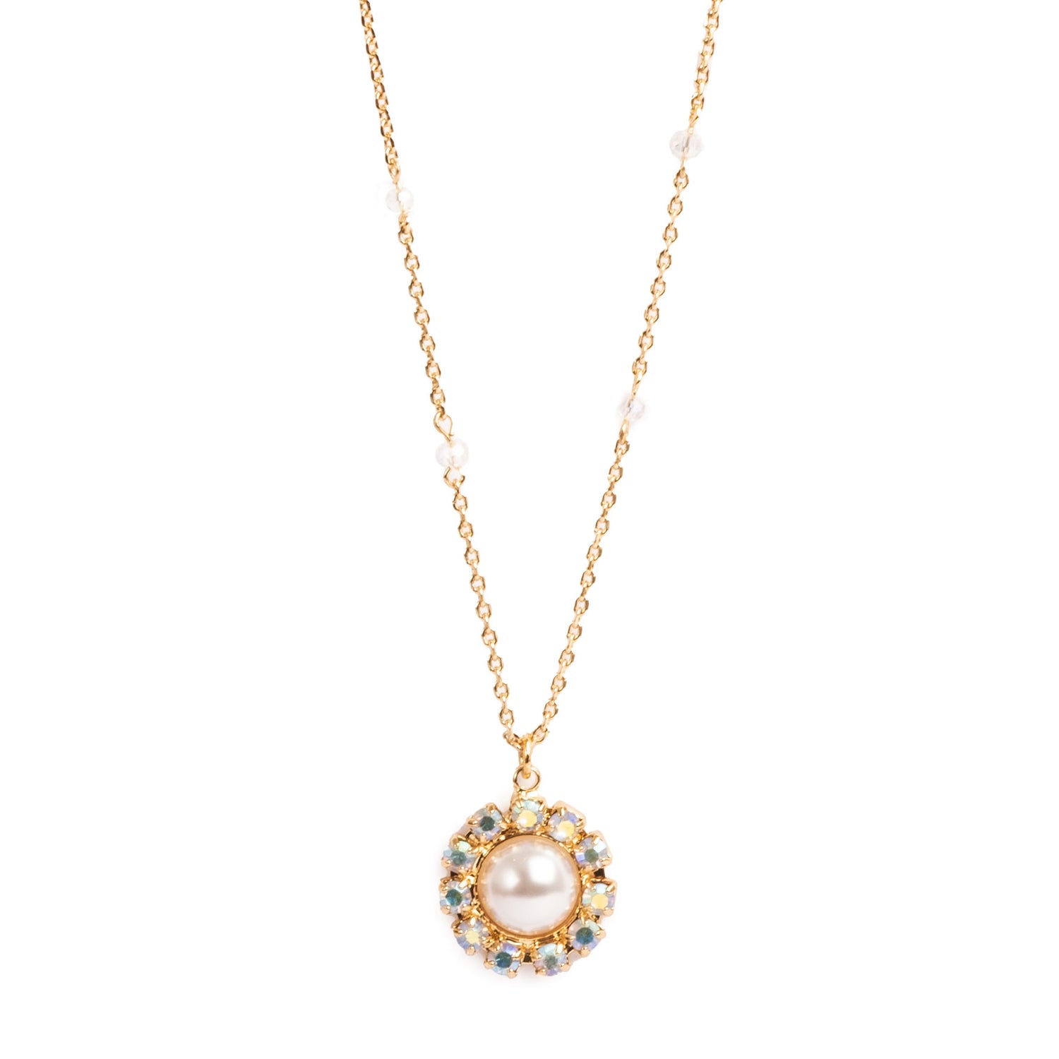 Dette kjedet med perle og krystallsteiner i Aurora Borealis effekt gir en følelse av nostalgi. Tidløs og perfekt til enhver anledning, alene eller lag-på-lag. med andre kjeder i kolleksjonen. Tone Damli by A&C Oslo, en smykkekolleksjon som oser av femininitet, lekenhet og eleganse. Høy kvalitet, laget i begrenset antall.