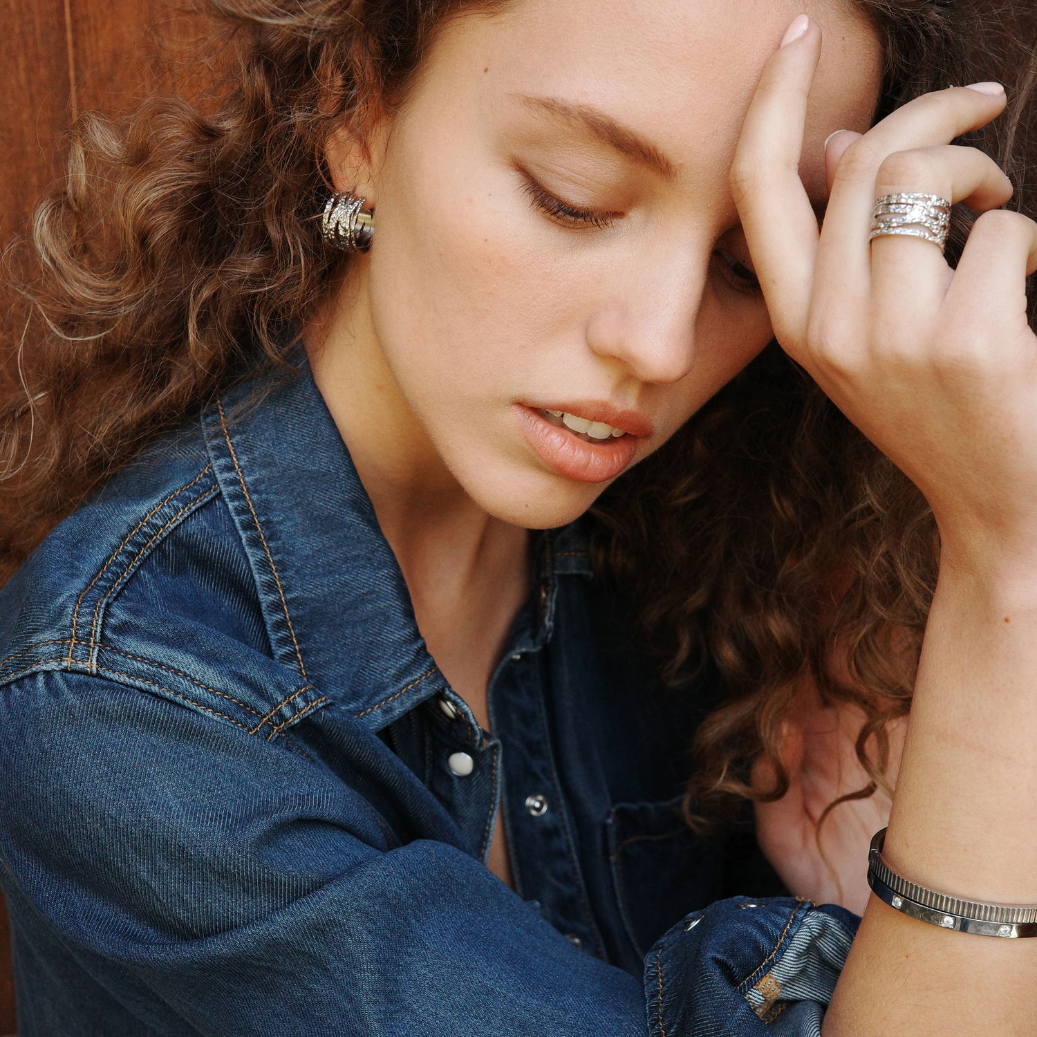 Vi elsker denne ringen. Den har en rå overflalate som gir et hint av vintage og eksklusivitet - samtidig som den har en veldig fin størrelse som gjør at du føler deg akkurat passe pyntet enten du skal på fest eller på kontoret. Våre smykker i stål har en tidløs, clean look og er kjent for å ha svært høy kvalitet.